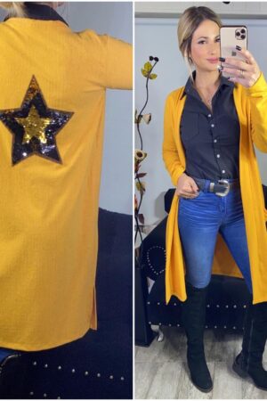 Saco largo, lanilla, con bolsillos, aplique cosido, estrella lentejuelas