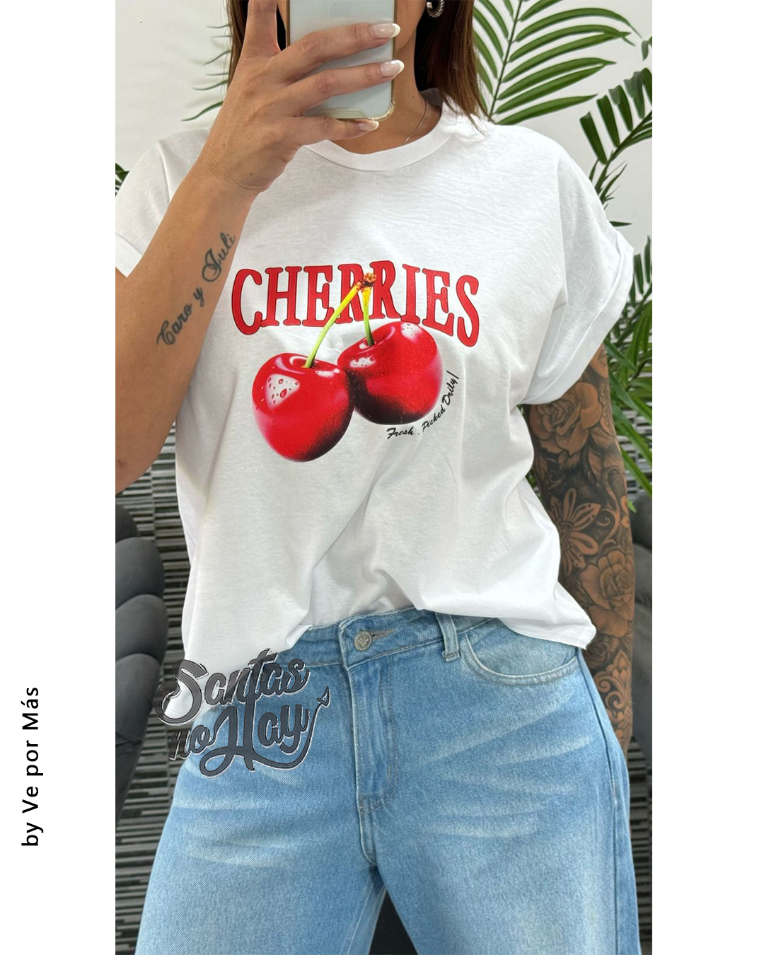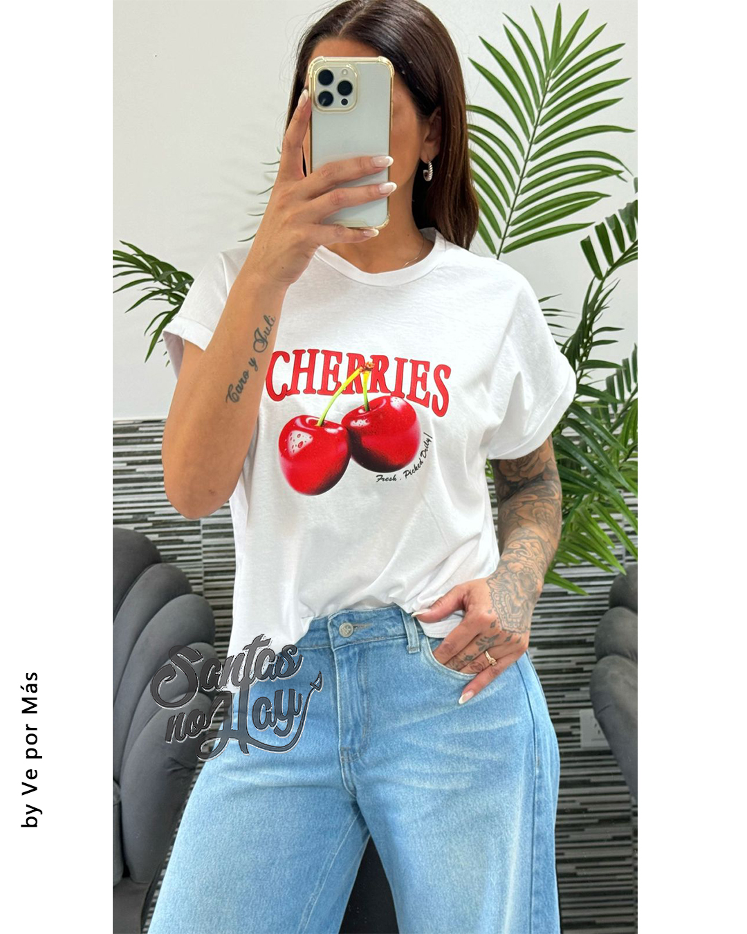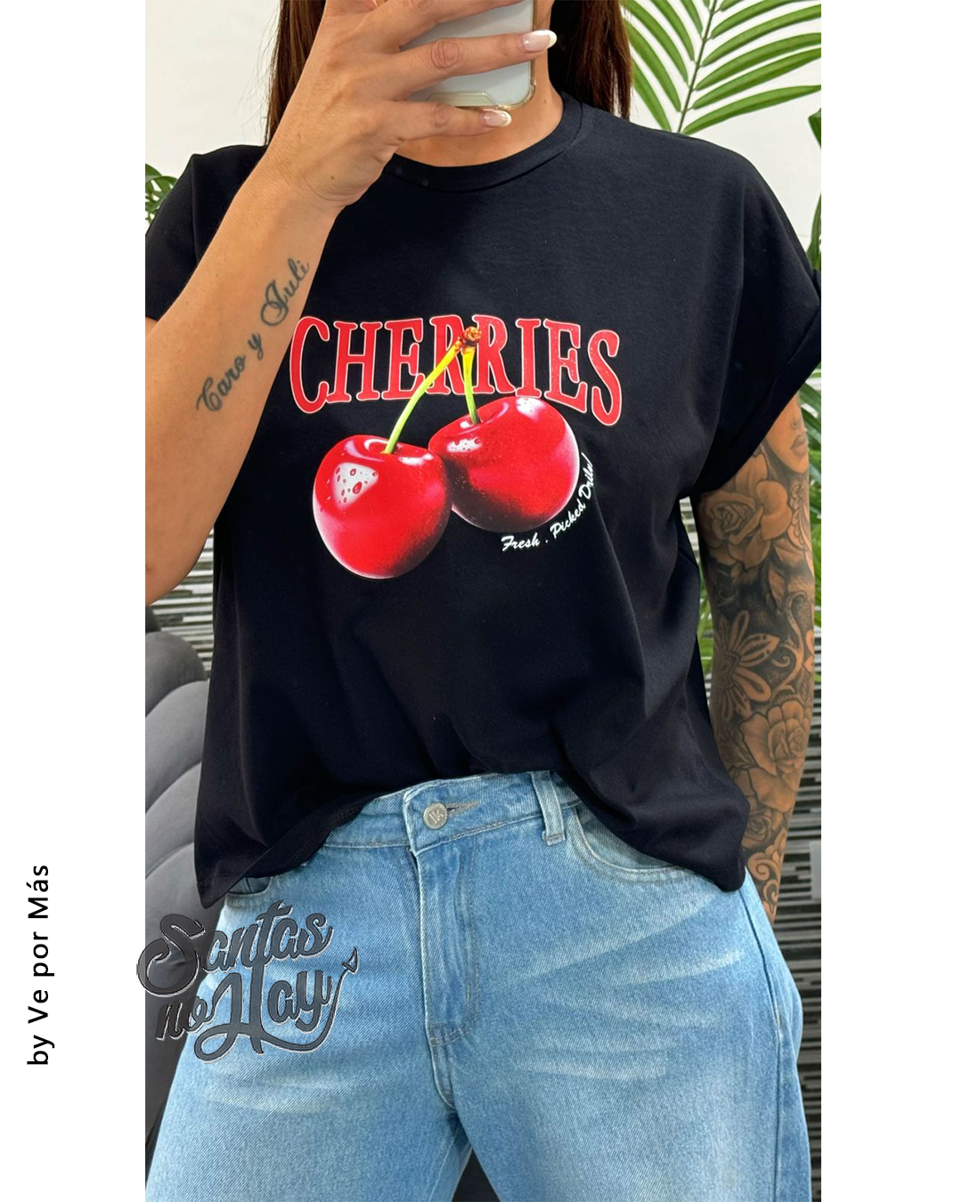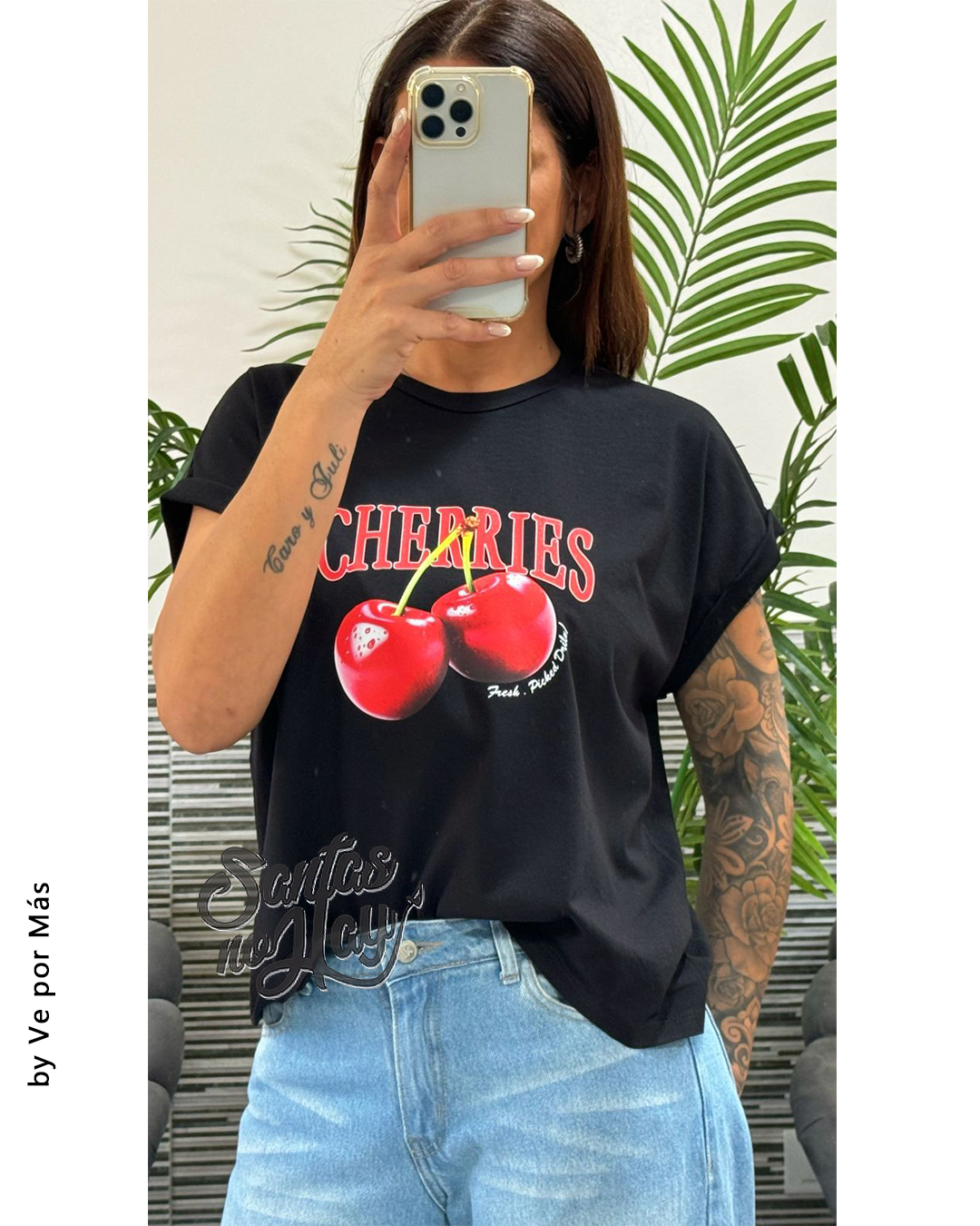 Remera algodón manga rebatible cuello redondo, estampa cherries +colores