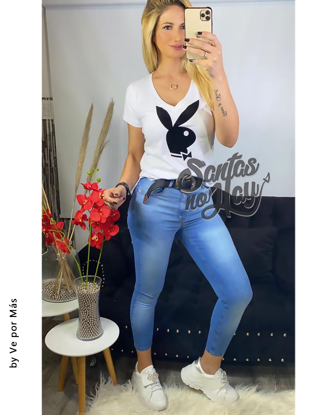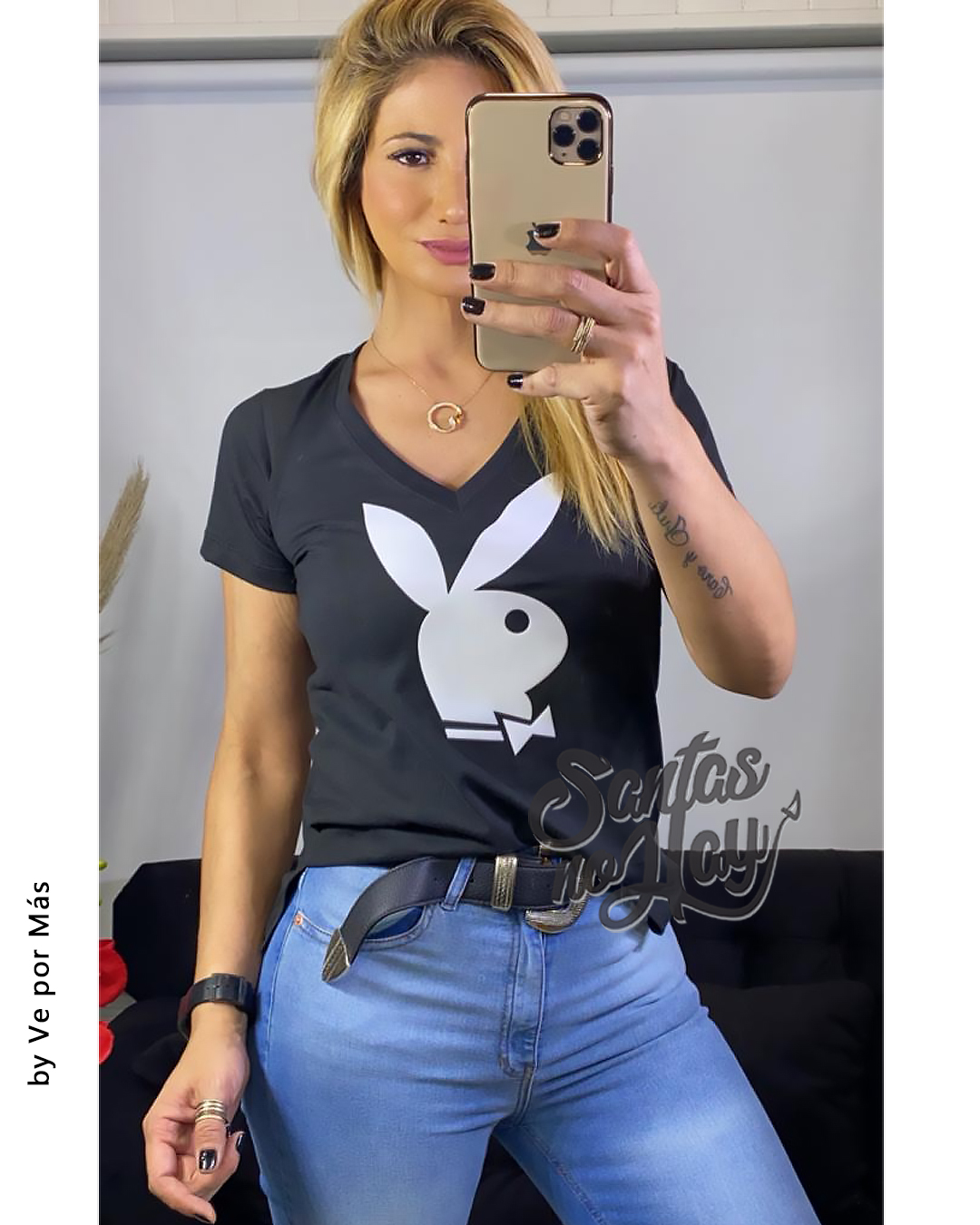 Remera de jersey de 100% algodón  peinado premium, de corte adaptable,  manga corta con doblez. Cuello escote en V con pespunete de recta .