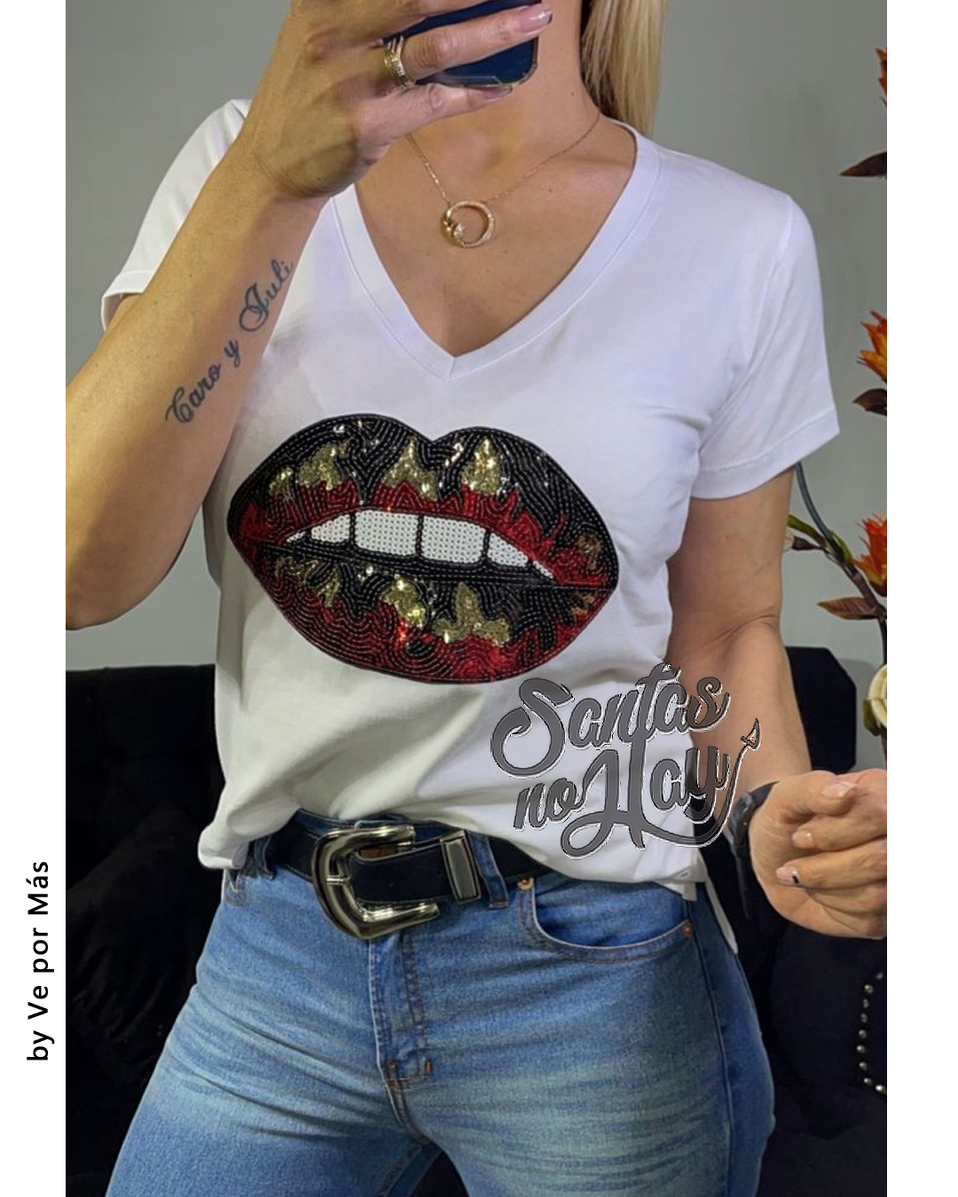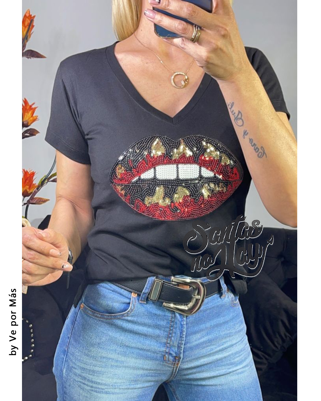 Remera en algodón peinado premium, aplique lentejuelas boca glitter xtalle